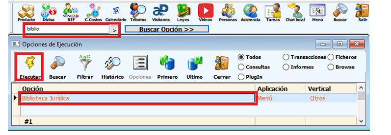 1.1 Desde el buscador de funcionalidades ubicado en la barra de botones del menú principal del sistema. Escribes el texto BIBLIO acto seguido presionar la tecla ENTER y se presenta el formulario contentivo de la funcionalidad solicitada.
