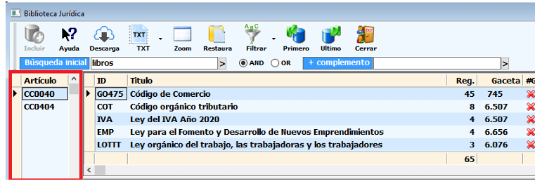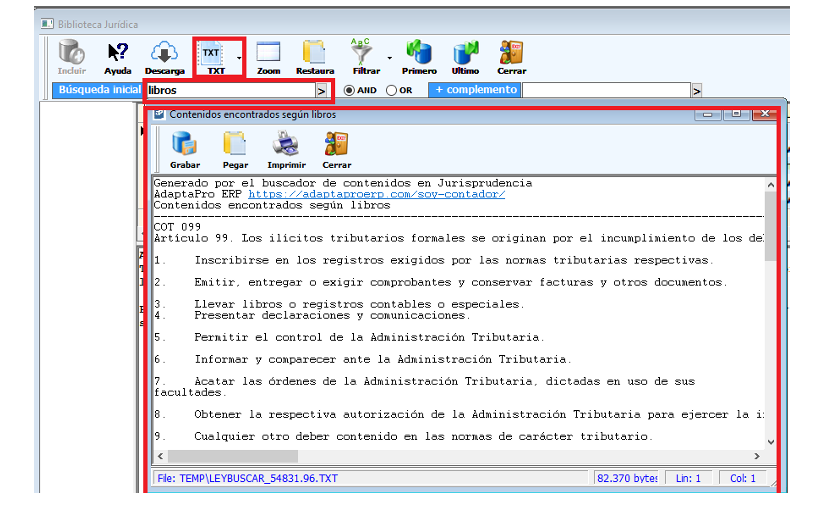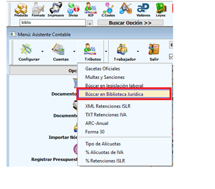 1.3 Desde el plugin “Asistente Contable”, sección tributos, opción, buscar en biblioteca jurídica.