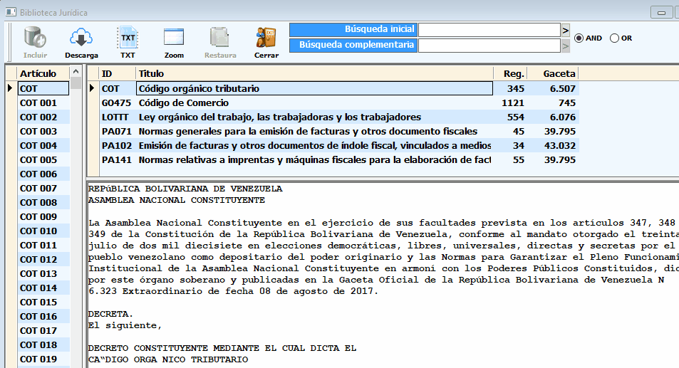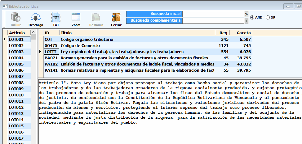Provee un formulario contentivo de la funcionalidad BUSCAR facilitando la búsqueda mediante la combinación de textos y operadores relacionales (AND y OR) logrando localizar cómodamente los contenidos en todas las leyes previamente digitalizadas.