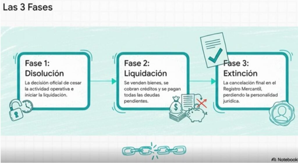 Esta es la modalidad legal y formal que busca la extinción de la personalidad jurídica de la empresa. Consiste en un proceso secuencial y obligatorio de tres fases.
