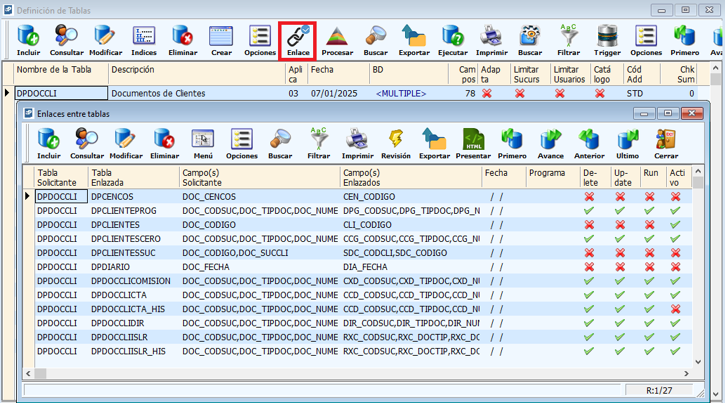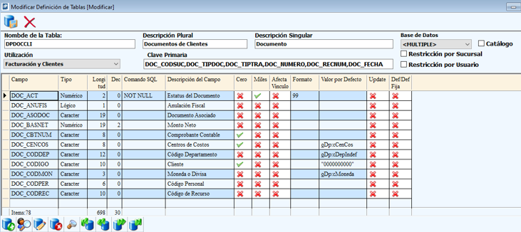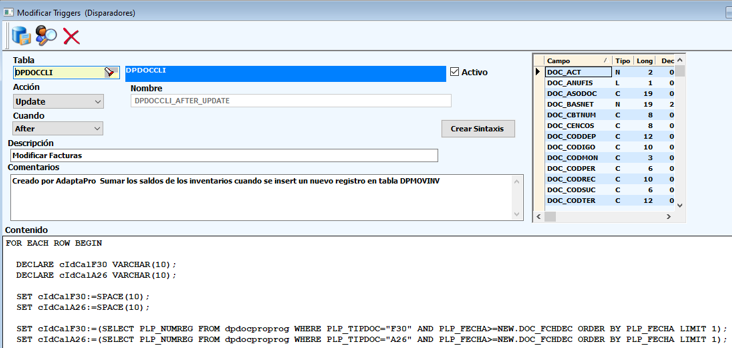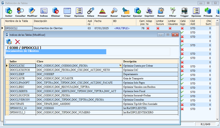 2.3 Base de datos para las empresas: La estructura de datos de cada empresa fue creada y actualizada según el diccionario datos y representa a cada empresa definida en el formulario “Empresas” y tabla “dpempresa”. Cuando el usuario ingresa en cada empresa, AdaptaPro revisa sus contenido vs sus componentes realizando su actualización de manera inmediata.