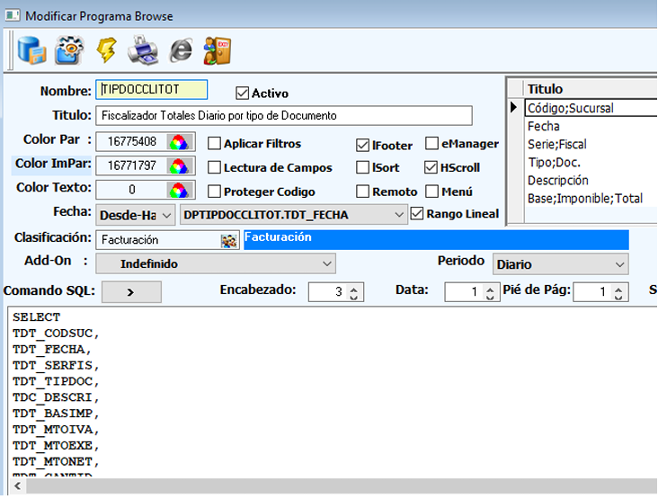 1.9 Facilita la creación de nuevos formularios con las funcionalidades: Incluir, Consultar, Eliminar y Modificar. AdaptaPro crea el código fuente DpXbase automáticamente y asistente de modo diseño para que el usuario pueda reposicionar los controles dentro del área del formulario, asignar fuentes de letras y colores de fondo y texto.