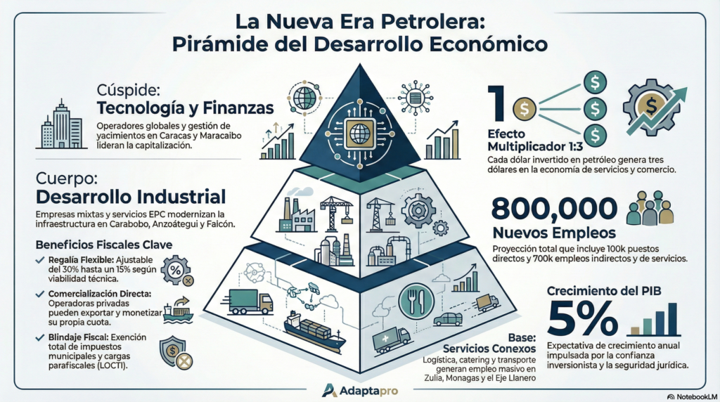Se estima que la reactivación de la cadena de valor, estructurada piramidalmente desde las grandes operadoras hasta los servicios conexos, impactará positivamente en el PIB no petrolero. Las zonas de Zulia, Oriente y Falcón se perfilan como los primeros polos de desarrollo, impulsando la demanda de bienes y servicios nacionales.