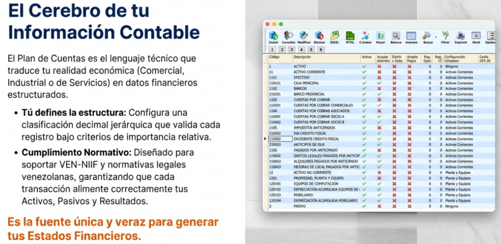 El Plan de Cuentas es el cerebro de tu información contable. Traduces tu realidad económica en datos estructurados bajo un lenguaje técnico decimal y jerárquico, garantizando que cada transacción alimente con precisión tus Activos, Pasivos y Resultados.